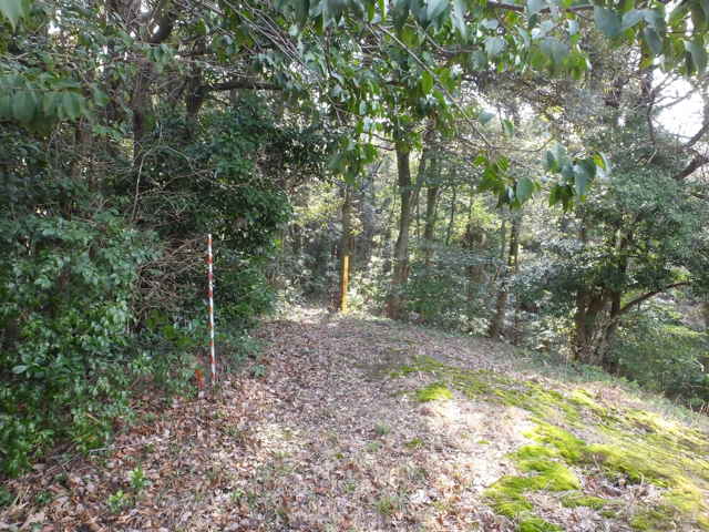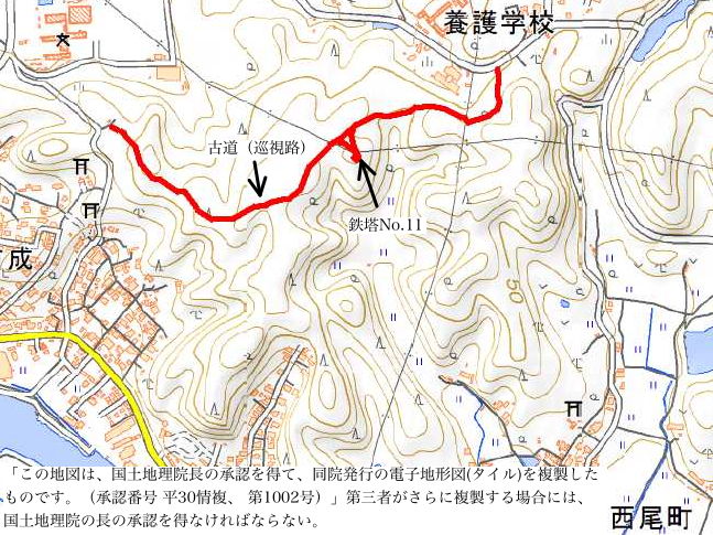 | 鉄塔No.10へ上がってきた古道(巡視路)まで帰って、鉄塔No.10からは古道の先へ向かって巡視路があるはずだったのを確認するのを忘れてしまったので、山裾をまわる径を進み、再度鉄塔No.10の巡視路を上がることにしました。巡視路を進んで、巡視路と養護学校付近と西尾町を結ぶ古い径が交差するところに、鉄塔No.10への分岐があります。ここから広く歩きやすい巡視路が上がっていました。 |