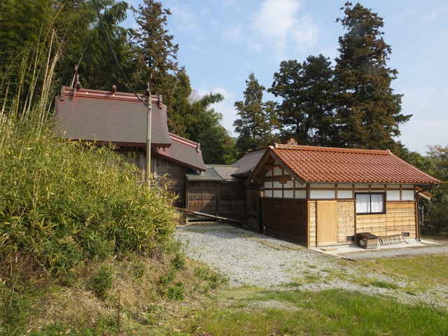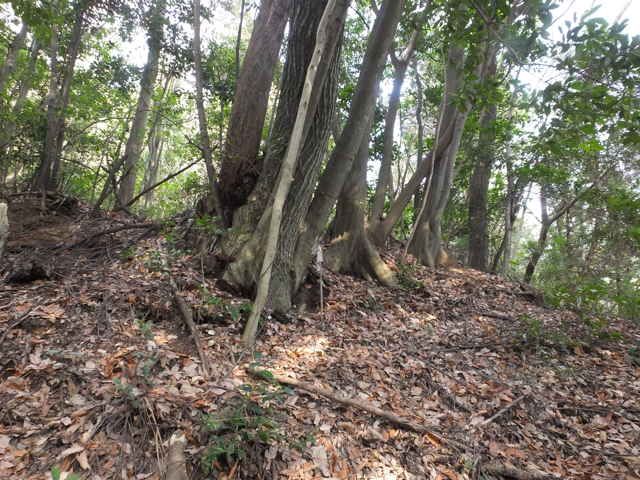 | 菅田線鉄塔No.10へ引き返す途中に南へ向かう分岐がありました。分岐の径は尾根沿いに下って行き、一部大きな竹が密生した場所もありますが、なんとか抜けることができます。小さなピークを越えたところの大きな樹のたもとに弊串が立ててあり、ここから急な斜面を下ると、西尾町の紐解神社の脇に出てきました。 |
