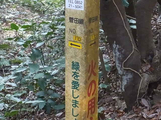 | もと来た径を通って鉄塔No.10まで引き返すと、鉄塔No.9を指し示す標柱がありました。最初は歩きやすい巡視路が続いていましたが、やがて径は細く急斜面になり、枯竹が多くなってきました。道を間違えたかと思いましたが、倒れた枯竹が通れるように切られているので、間違いないと思って下がると、西尾町の細い舗装道路に下りてきました。 |