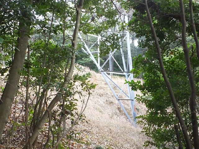| さらに古道(巡視路)を南へ進んでいくと、北へ向かって分岐があり、鉄塔No.12の標柱が立っています。広く歩きやすい径を行くと、鉄塔を過ぎて、給食センターの近くへ下りてきました。 |