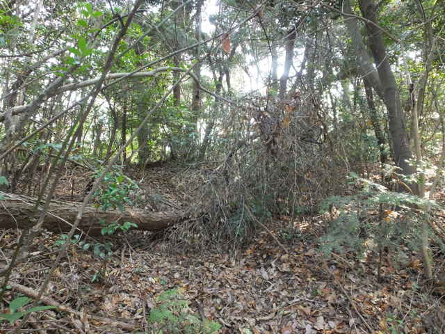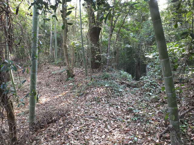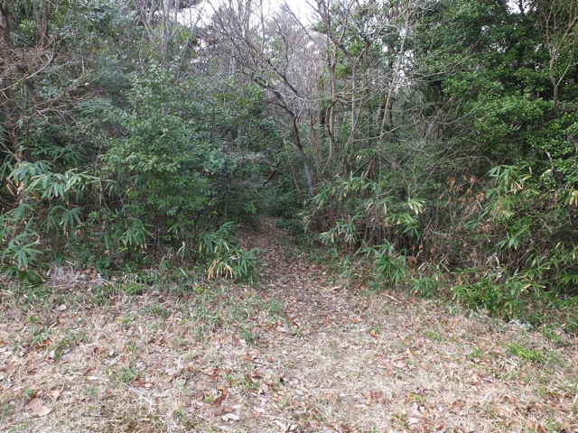 | 古道(巡視路)へ引き返し少し進むと、南への分岐があります。分岐に入ると、すぐに径が分岐するので、まず左へ進んでみました。稜線は広く歩きやすい径が続きますが、斜面を下がるようになると、竹林の中の細い径になり、枯竹を避けながら、下りるようになります。山を出たところは、島根札第12番海潮庵の脇でした。 |