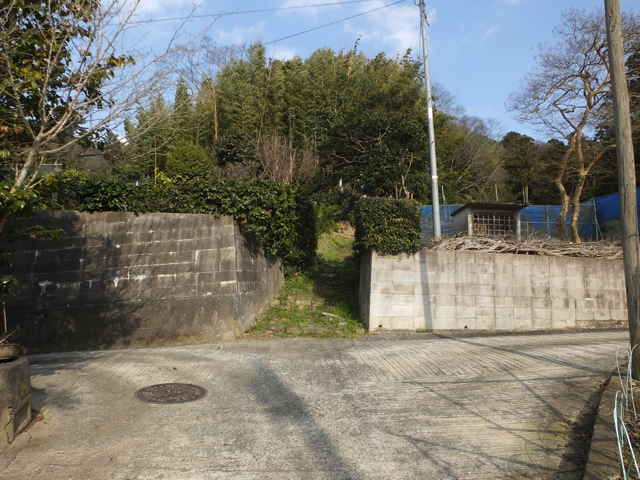 | 分岐のところまで引き返し、直進すると今度はまっすぐ谷の竹林の中を下りていく径になりました。竹藪の倒れた枯竹は片付けられており、今でも人の通りがあるようです。径には30cm角の敷石が並んでおり、古道の雰囲気が残っています。径は竹藪を抜け、畑の脇を通って、民家の脇へ出てきました。市成倶楽部(集会所)の脇から奥へ入った谷でした。 |