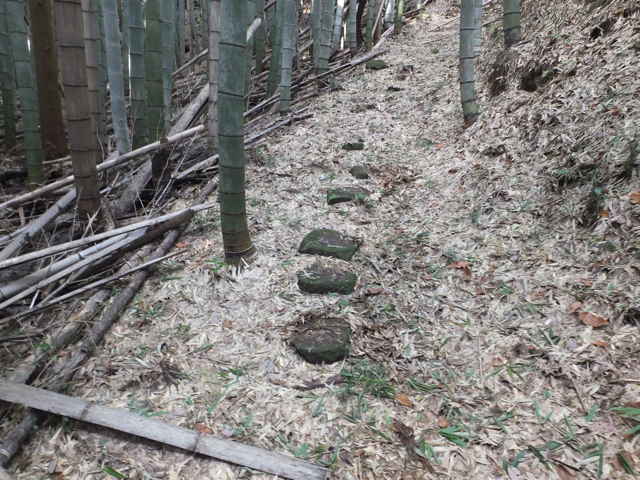 | 14:17 分岐を直進する。 | 14:18 竹林内を下がっていく。 | 14:20 約30cm角の敷石が残っている。 |