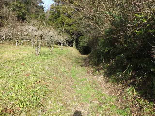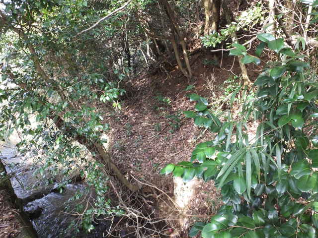 | 12:16 野原町 峠の木の根元に祭祀跡がある。 | 12:17 峠を下って径が続いている。 | 12:17 柿畑跡の脇を進む。 |