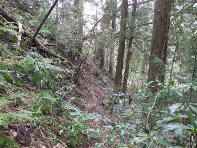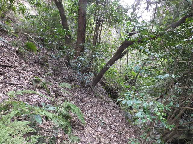 | 14:00 斜面の上に径らしきものが見える。 | 14:01 径があり、下っている。 | 14:03 径の上方は藪となって先が見えない。 |
