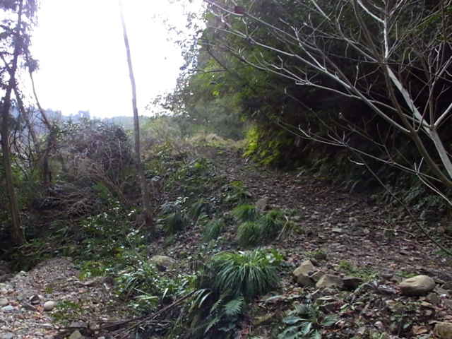 | 12:47 径を探し、斜面の踏跡らしきものへ上がる。 | 12:53 踏み跡も見えず藪になり、谷へ引き返す。 | 12:56 荒れた谷を下がる。 |