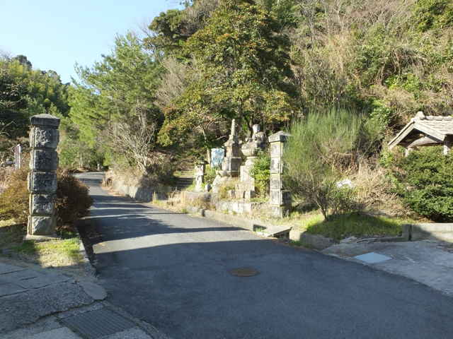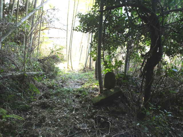 | ・別所道 上本庄町川部地区の最奥の人家横から山へ入ると石地蔵の脇に道標が倒れており、左枕木山、右別所道と刻まれています。左の枕木山への径は殿さん道と呼ばれ、県道枕木山線の旧道へ上がっています。 道標から数m上がると径が分かれていて、まっすぐ谷に沿って上がると、はっきりとした踏み跡が続いており、じゃまになる枝も伸びていないので、溜池や鉄塔の管理道として使われていると思われます。溜池の縁を周って、尾根を越えて行くと、径が不明になってきますが、斜面の木の並びに沿って進むと、また踏み跡が現れました。谷に下りて小さな流れを渡ると、踏み跡が不明になりますが、正面の斜面に尾根に向かって斜めに上がっていく踏み跡が見えました。小さなピークを越えて進んでいくと、径の脇に1m以上ある立石がありましたが、何も刻まれていないようでした。立石の手前から右へ踏み跡があり、たどってみると鉄塔がありました。 立石までもどり、まっすぐ行くと段差があり、その先は明るく開けた場所に出てきました。段々になった畑か水田の跡のようです。左にも分岐がありましたが、まっすぐ進んだ先に人家の屋根が見えるので、進んでみると、藪となってしまったので、元へ引き返しました。左の竹林の脇を行くと、径は広く、元は舗装道路だったようで、竹のトンネルを抜け、柿畑を上がっていくと、県道枕木山線の旧道に出会いました。分岐は車止めがしてありますが、以前は作業道として使われていた感じです。 |