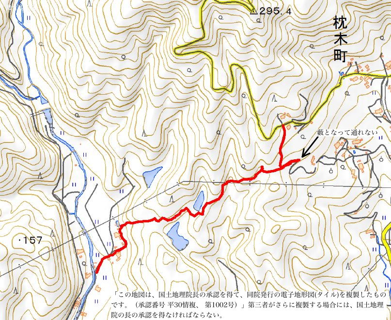 | 13:00 県道枕木山線で旧参道は切られている。 | 電柱脇へ出てきた場所 | 電柱No.82 |