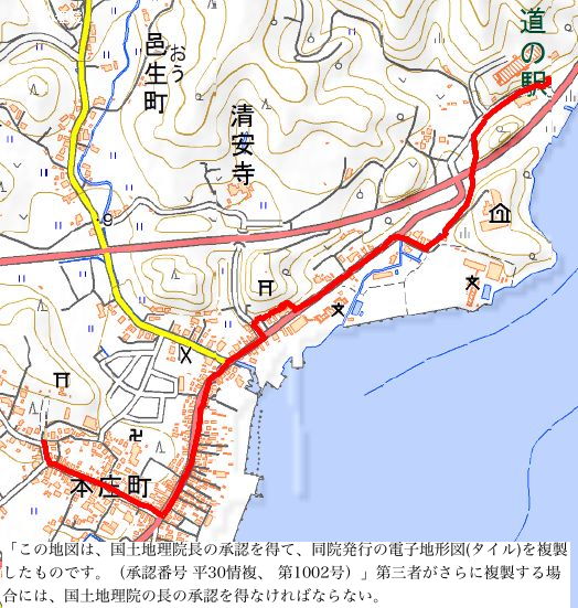 | ・松江美保関往還 本庄町〜邑生町〜野原町 時間が少しあったので、本庄町付近の美保関往還を少し歩いてみました。木並から下がってきた道は黒住教の教会の前を過ぎ、県道(旧国道)沿いの本庄町の街並みへ入ってきます。黒住教会前の道路の反対側に小さなお堂がありました。街並みを邑生町に入り、清安寺の入り口の小路へ入ると、道の両側に萬年山、清安寺と書かれた門柱があり参道の入り口となっています。その手前から右手に往還は家並みの後ろを通っていたようですが、今は通れるような道はなく、山際の擁壁の上を歩いてみました。擁壁は途切れて行き止まりますが、途中に下りる階段があったので、民家の裏に下りました。地形図の1960年代の古い写真を見ると、以前はこのあたりは山際まで田んぼが広がり、人家は見当たらないので、山際に道があったものと思われます。 民家の脇から県道へ出て、本庄中学校の入口前から山裾の草地を水路沿いに上がり、国道を横切って草地を歩き旧国道から峠を越えると道の駅の裏に出てきます。道の駅の大型車の駐車場の北側の法面に斜めに上がっていく小さな道がつけてあるので、これが「歴史の道調査報告書」に記載のある、「峠を下って左の柿畑に登り山中に入る」道ではないかと思います。 この地域の詳細とこの先は、次回に確かめることにします。 |