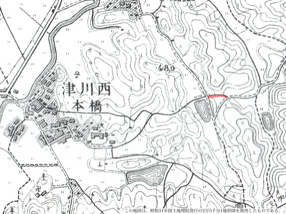 | ・嵩道 12月19日に歩いた嵩道のなかで、西川津町の団地を抜けて、元溜池の土手道が大内谷からの道と合流したあと山を越えているところを確認していなかった。今回、畑の中から山越えの道へ入ると、最初は笹も刈られて、広い径が確認できるが、次第に笹が密生し、ピークあたりでは藪となって径らしきものが確認できなかった。現道の峠は切り通しとなっており、旧道の分岐部分は切り通しの中に取り込まれてしまっているのかもしれません。現道に沿って林内を下がってみましたが、径らしきものはありませんでした。 |