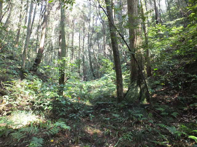 竹林内に広い径がある。 | 尾根への径がなく、間違ったようだ。 | 谷が分岐し、左へ行く。 |