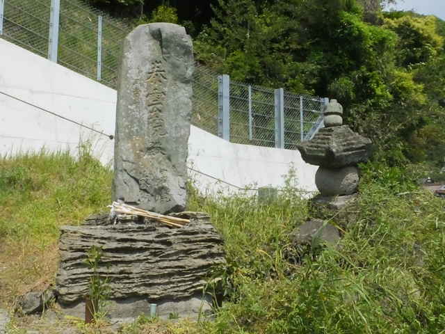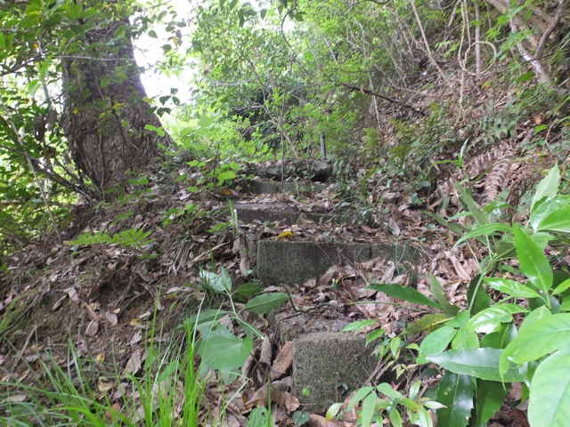 福浦から宮ノ谷までは、県道を進みます。資料には「『天王さん』の前を通って宮ノ谷に入る」とありますが、「天王さん」が何を指しているのかわからず、地元の人に聞いてみると、はっきりしませんが、入口の山を「天王さん」と呼んでいたという話もありました。県道から少し集落にはいると、民家の間を東へ伸びる路地があり、これが往還のようです。民家の間を抜け、空き地を横切って、「なべや別館」のある道路法面の崖上を中学校跡地の前まで続いていたようですが、今は通れそうにありません。 中学校跡地の広場を東へ進むと、突き当りから斜面を北へ向かう踏み跡が上がっています。あまり藪になっていないので今でも使われているようです。径はどんどん上がっていき、畑のような場所に出ますが、資料とは少し上がりすぎているようです。少し引き返して、東へ入れる径を探し、踏み跡らしきものをたどってみました。畑の跡に植林したような林を過ぎると、径らしき感じもありますが、やがて藪となって、進めなくなってしまい、このルートは諦めました。 県道へ戻り、玉井斎場の前を通って、 県道雲津線を集落へ少し入り、山へ入る径を探し、荒れ地にあった踏み跡を入ってみますが、その先の急斜面の竹林に径のようなものは見えません。竹林のすぐ上が県道雲津線なので、急斜面を竹につかまりながら上がりました。上がった場所の向かいの道路斜面に、踏み跡が上がっていて、少し荒れていますが、すぐに尾根筋へ上がり、栗畑になっていました。栗畑を抜けると、県道雲津線に出会い、県道を上がると「男鹿古墳」の案内標識があり、その先の右手の墓地から下がっていくと、法面擁壁の階段があり、西長浜集落へ下りてきました。集落の県道脇に「泰雲院殿」(お芋さん)の石碑と五輪塔がありました。 県道を東長浜へ進み、集落の奥へ入ると墓地がありました。墓地の右奥から山へ向かって径が上がっています。男鹿から雲津へ向かう車道ができるまでの、長浜越の旧道になります。径にはコンクリート板が敷いてあり、また所々に手すりのようなものも残っていました。径は峠まで、つづら折れに上がっています。木々の枝が伸びて、荒れ放題になっていて、道路の名残がなければ、径をたどるのを諦めていたかもしれません。 往還は県道雲津線に出会う手前から、更に斜面をトラバースして尾根へ向かって上がっていき、畑の跡のような平場へ着きました。ここから東へ向かって径を探しますが、やがて藪となって、踏み跡らしきものもなくなってしまいました。ここから杢井越まで、あと500mほどですが、このルートは諦め、松江美保関往還の踏査はここまでとしました。 |