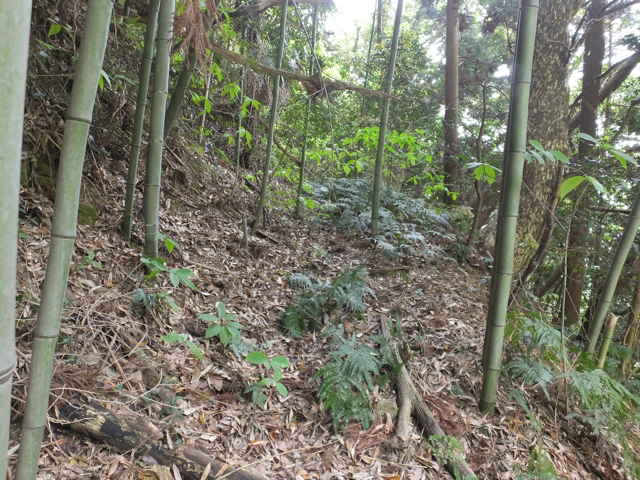 | 美保関町福浦男鹿 県道雲津線を集落へ入る。 | 集落奥の荒れ地の踏み跡を東へ入る。 | 径は見えないが、急斜面の竹林を上がる。 |