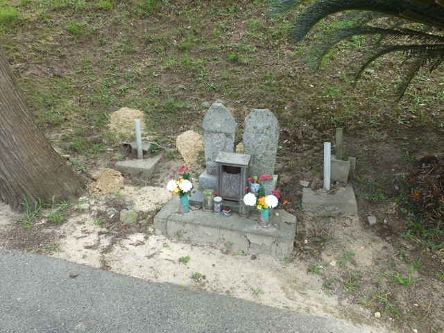 | 西浜佐陀町 往還は国道と並行して西進する。 | イングリッシュガーデンの前を進む。 | 大墓屋の隣地に供養塔と丁地蔵がある。 |