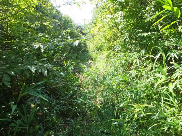 径に沿って電柱が立っている。 | 西長江町 峠を越えると笹が刈られていない。 |