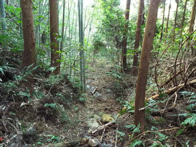| 西生馬町 13:00 植林地の斜面を上がって行く。 | 13:02 小さな谷の中を上がって行く。 | 13:04 植林の中をまっすぐ上がる。 |