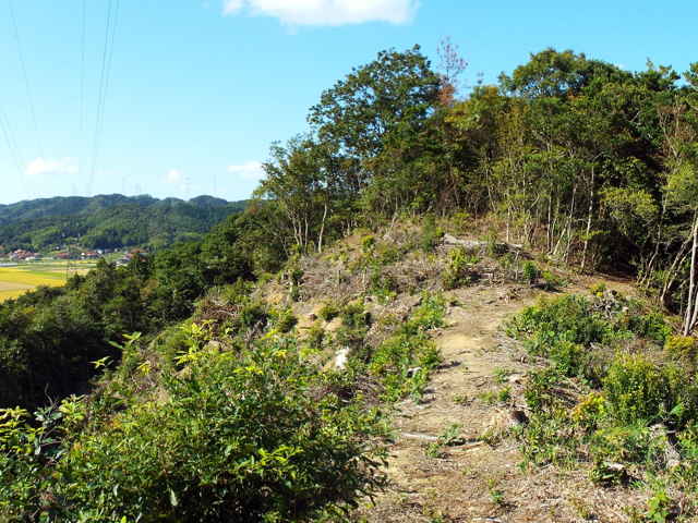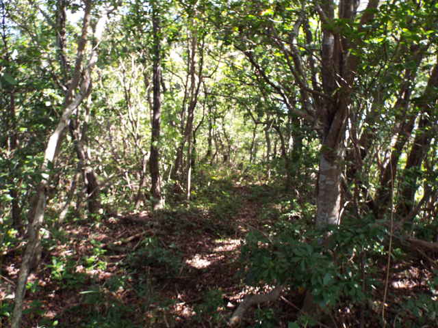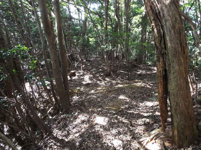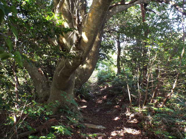 | 林道東西生馬線の鉄塔の下になる場所で巡視路を探すと、何か所か踏み跡が山へ入っていました。最初の2箇所はあまり管理された様子がなく、3番目を入ってみると、巡視路標識が立っていました。 小さな谷の中をまっすぐ上がると、植林の中を進み、植林地を抜けると傾斜がきつくなってきます。大きなヤマモモの木の脇を通り過ぎると、やがて径は平坦になり、また大きなヤマモモの木があり、その先に鹿島線鉄塔No.42がありました。鉄塔からは市街地や恵曇や日本海が見渡せました。 鉄塔の横から巡視路が伸びており、快適な尾根径が続いています。7分ほど尾根径を進むと、径が分岐しており、右の尾根を上がると三角点へ続いているようなので、上がって見ることにしました。少し上がると大きなヤマモモの木があり、ここからは恵曇方面や宍道湖が見渡せました。この場所は見晴らしが効くように木が伐採されているように思われました。ここからさらに7分ほど尾根を上がって行くと、小高くなったピークに四等三角点(小谷 190.92m)がありました。 分岐へ帰り尾根径を下がり、U字形になった径や細い尾根を過ぎると、小さな鞍部に下りてきます。径は直角に右へ曲がって斜面を下っていますが、地図を確認すると、鉄塔を過ぎているようでした。引き返して送電線を確認すると、枝葉の間に鉄塔が見え、木々の間に径が分岐していました。分岐から少し上がると鹿島線鉄塔No.43につきました。 鞍部に帰り右の斜面のV字形になった径を下がると、尾根径から植林地の脇へ出て、鹿島線鉄塔No.44へつきました。鉄塔のある尾根は伐採されており、朝日山や講武の平野やその先に日本海が見渡せました。 巡視路は尾根の先から斜面に下がって行き、また尾根径を下がっていきます。尾根は左へ曲がり、その先の伐採された尾根の先に鉄塔が見えました。鹿島線鉄塔No.45は、斜面の狭い場所に立っていました。 鉄塔の手前からは作業道が斜面を下っていて、3分ほど下がると、道路脇の斜面の上に石灯籠が1基あり、少し離れた道路脇には小さな石や祠が祀られていました。ここには寺とか神社とかがあった場所なのかもしれません。少し下がると、県道御津東生馬線に出てきました。 この巡視路は、歩きやすい尾根径が続き、鉄塔から展望もあるのでハイキングコースとして推薦できるルートだと感じました。 |