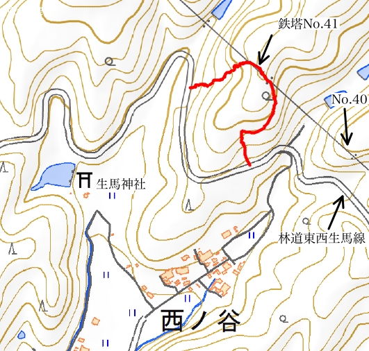 | 西生馬町 12:59 林道脇の斜面に踏み跡がある。 | 少し上に巡視路標識がある。 | 鉄塔No.42を指している。 |