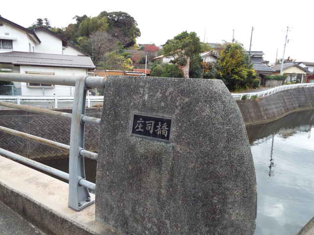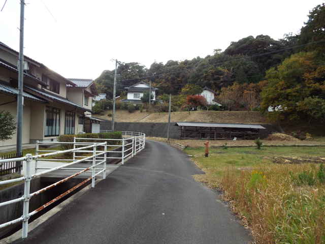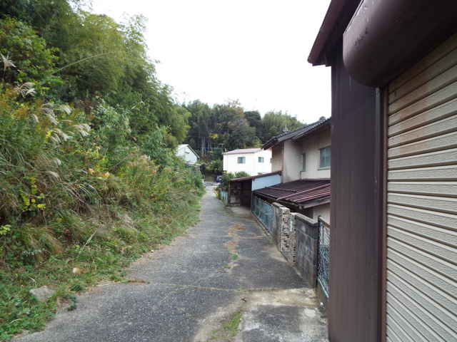 | 農林高校の運動場を横切った旧街道は、現在の忌部川にかかる半原橋より少し南側を渡ったそうです。橋を渡ったところの道路脇に地蔵像跡があったと資料にはありますが、ここら辺りは県道松江木次線の高架工事で新しい橋脚が立っており、昔の面影はありません。ただ橋脚のたもとに新しい石地蔵があり、これが以前の地蔵像跡を復元したものか、他の因縁によるものかはわかりません。 高架下を過ぎると、旧街道はパナソニックの敷地内を通って、敷地の西端の白龍大明神の前に出ていたということですが、今では道はありません。県道のパナソニック前を通り過ぎると、敷地に沿って細い道があり、フェンス内にある白龍大明神の前まで続いています。資料によると、白龍大明神は古い記録にはなく、会社が新しく祀り直したのではないかとしています。(パナソニックに確認すると、企業神社だということです。) 白龍大明神の前から細い道が続いており、これが旧街道になるようです。旧街道は、湖南テクノパークへの進入路を横切って、県道浜乃木湯町線の一段高いところを南に向かっています。舗装道路は途中で県道へ出ていますが、さらに無舗装の道、そして畑地のような空き地が続き、消防学校の手前で県道に合流しています。この県道へ合流する部分は市有地となっているので、そこへ連なっている民家の後の畑地のような場所も、道路跡かもしれません。 消防学校入り口の少し南の県道の右側擁壁に四角い穴が開けられ、一丁地蔵が祀られています。資料によると、県道の「坂道北山手の畑の中」にも地蔵像があるとされていますが、山陰自動車道の整備によって県道も移設され、今では探すこともできません。 現在の県道は山陰自動車道の高架下を抜けてすぐ直角に右折し、峠に向かっていますが、高架の手前の藪の中に舗装道路の跡が見られ、移設前の県道は自動車道に沿って峠に向かっていたようです。 |