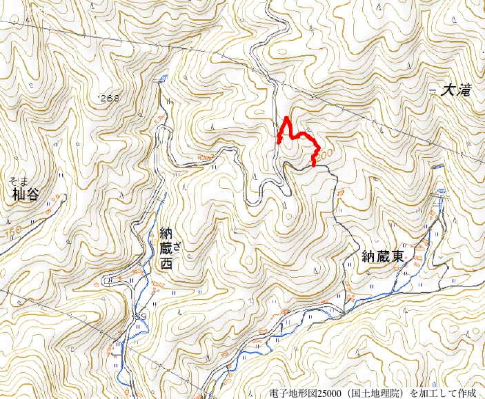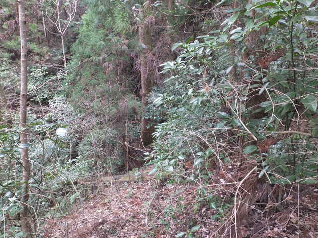| 先日2月2日に澄水山旧道(仮称)を探して歩いた時に、林道澄水山線から斜面を上ったところに尾根径があったので、どこへ下りていくのか確かめることにしました。とりあえず、この径を納蔵東旧道(仮称)と呼ぶことにします。 林道澄水山線から斜面を上がると尾根にはっきりとした径がありますが、しばらく行くと正面の急斜面で径が消えてしまいます。踏み跡がないかと左へ回って見ますが、踏み跡は見つかりませんでした。やはり急斜面を上がるしかないようです。斜面を少し上がると尾根径があり、しばらく上部を探してみましたが、下りの分岐は見つかりませんでした。 元へ引き返し、尾根径を下がってみると、はっきりとした径が残っていました。ときどき倒木があったり、茨が枝を伸ばしているところもありますが、概ね歩きやすい径が続いています。 しばらく下がったところで、斜面に径が見えなくなり、方向を確かめて斜面を谷へ下がってみると、踏み跡があり、谷を上がっていました。踏み跡を遡ってみると、先程斜面を下がったところへ出て、枝を伸ばした木々の枝葉で径が隠れていたようです。ここを過ぎるとすぐに、納蔵東から林道澄水山線へ上がっている道に出会いました。 旧版地形図によると、ここから旧道は向かいの谷あいを下がっていくようですが、林内には耕作地の跡のような感じはありますが、踏み跡のようなものは見当たりませんでした。 |
