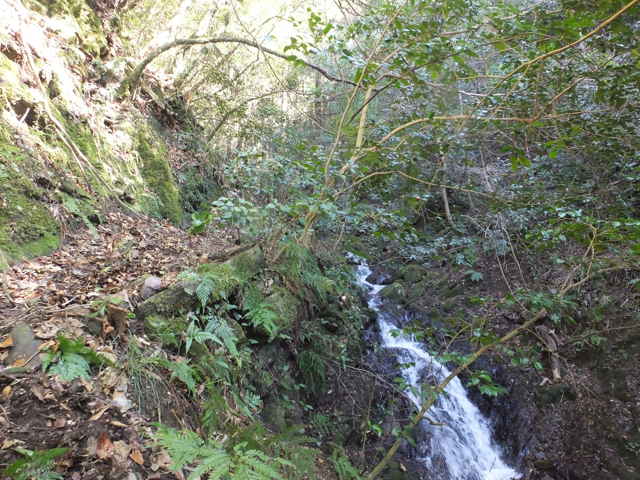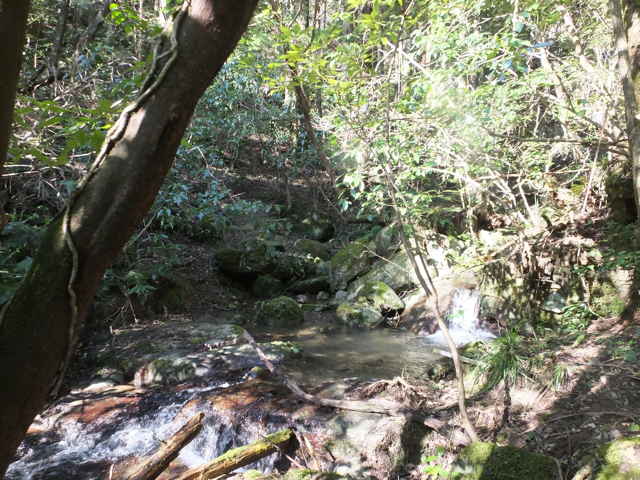 | 2月2日に行った大平滝の先から谷を上がっていく旧道を探して、再度谷へ向かいました。この旧版地形図にある旧道をとりあえず持田川旧道(仮称)と呼ぶことにします。 大平滝との分岐から5分ほど持田川を遡ると、開けた斜面の草地にでてきます。ここから川へ下りて行くような踏み跡のようなものもありますが、旧道は川に下りずに川の斜面を通ったようです。石積みのある滝の上部の径を過ぎ、川を渡ると大きな滝があります。その滝の脇を上がるように手前の斜面に径があったと思われますが、崩れているようです。崩れた斜面にロープを張ろうとしましたが、ロープを結ぶしっかりした木がなく、うまく張ることができませんでした。また次回に考えようと思います。 なんとか斜面をトラバースし、滝の上に上がると、径が続いていますが、川沿いには倒木があり、乗り越えて進みます。この先には更に大きな滝があり、急斜面の脇を上がることができないので、その手前から斜面を斜めに上る径があります。1段上がり、さらに1段上がると、はっきりした踏み跡が上へ続いています。 木々に隠れて川の様子は見えませんが、大きな滝の上部を過ぎたと思われるころで、斜面の径は藪の中に入ってしまいます。先日は少し枝を切りながら進んでみると、藪の中に踏み跡が続いているように見えました。本当にこの先に径が続いているのかと不安になりますが、さらに枝を切りながら数メートル進むと、藪を抜けて、踏み跡が見えてきました。踏み跡を進むと、長椅子のような長い大きな岩があり、その先は平坦な場所になり細くなった川と出会います。急な山径を上がった村人が、休憩場所として使っていたのではないかと思われるような場所です。 川に出会った場所から林内に踏み跡が見えませんが、川沿いに上がっていくと、石が一列に並んだ場所があり、なんとなく径の跡のような感じもします。その先は川へ繋がっており、川を渡ると、川沿いの林内に踏み跡が上がっていました。しばらく上がると、正面に大きな岩があり、川へ下りても急斜面で通れそうにありません。引き返すと、左の斜面を上がっていく踏み跡が見えました。斜面の細い径を抜けると、植林の林の向こうに、林道澄水山線の白いガードレールが見えました。 しばらく川沿いの林内に踏み跡が見えますが、やがて踏み跡は見えなくなり、谷が2つに分かれます。旧版地形図を見ると、左の谷を上がって行くようですが、時間的にも体力的にも今日はここまでとし、右手の急斜面から林道澄水山線へ上がり終わりとしました。 |