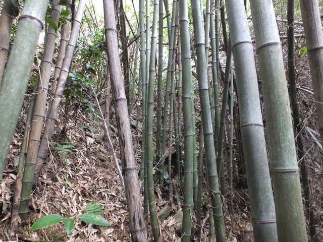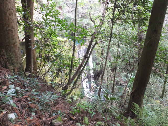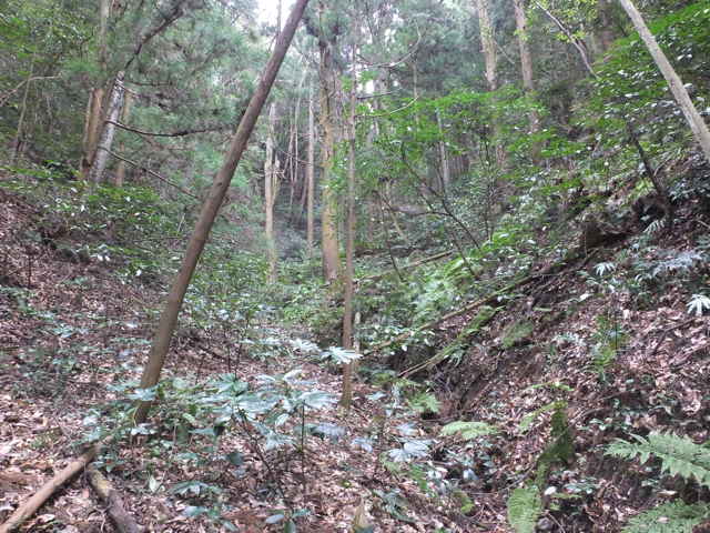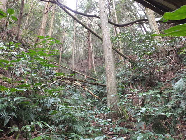 | 林道澄水山線から納蔵西の集落へ入り、谷沿いに上がって行くと、右下に大きな堰堤が見え、更に上がると白滝があります。林道澄水山線からはここが入り口になり、白い標識が立てられています。白滝の上部の川に橋が架けられており、橋を渡って右側には細い滝が落ちています。 橋を渡って左に斜面を上る径があり、すぐに右へ曲がると径には枯竹が倒れ込んで、歩きにくくなります。枯竹を避けながら進むと谷へ出てきますが、踏み跡は見えなくなってしまいました。谷の中にコンクリート製の低い擁壁が見えましたが、何なのかはわかりませんでした。 急斜面の藪を上がると、畑の端の荒れ地に出て、すぐ上で林道澄水山線に出会いました。この畑は谷を埋め立てられてできており、谷の急斜面はこの埋め立てによるものと思われます。旧道は畑の中ほどを上がっていたとのことです。 林道澄水山線を上がり、最後の民家の前を過ぎて、カーブの手前から谷へ入ります。谷にはわずかに踏み跡があるように見えました。谷を奥まで進むと、急斜面になってピークまで上がってしまうので、以前にここら辺に上がるだろうと思っていた場所の方へ向かって急斜面を上がりました。 急斜面を上がった平らな場所に、コンクリート製の円筒形の井側のようなものがあり、水道管のようなものが谷へ向かって下りていました。ここからすぐ林道澄水山線に出会いました。 旧道は林道澄水山線に出会ったところから更に山の尾根を上っているので、林道の向かいの斜面に上がってみました。斜面の上にはしばらくは踏み跡がありましたが、やがて踏み跡が見えなくなったので、尾根に向かって斜面を上ってみました。少し上がると、尾根径がありました。最近では人も通ることがないようで、枝が伸びて荒れ気味でした。尾根径は、下にも続いているようで、納蔵東への径があるのかもしれません。尾根径を上がって行くと、鉄塔が見え、巡視路に出会いました。この巡視路が北山縦走路の持田別れに通ずる旧道の一部になっています。 旧版地形図にある旧道は概ねこのルートであろうと思われますが、谷に踏み跡が見えないので、機会を見つけて再度ルートを確認してみようと思います。また納蔵東へ下がると思われる尾根径も下がってみようと思います。 |
