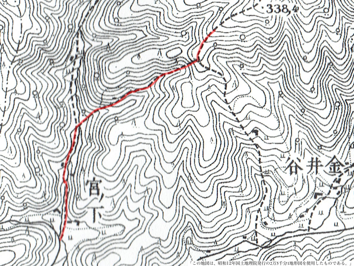 昭和12年発行旧版地図。 | 点線は確認済みの旧道 |