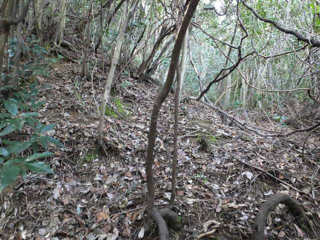 | 2019年5月25日に一度上がったが星上峠の手前の藪で引き返した径へ再度向かってみました。 宍道湖南部広域農道から林道須田・大谷線を入り、耕地に沿って谷を奥へ向かって上がっていきます。耕地を過ぎ林内に入ると左手に作業小屋があり、その先で橋を渡って、さらに谷を上がっていきます。林道の分岐があり、左へ橋を渡り上がっていくと、ぬかるんだ径がしばらく続き、その先で林道が分岐します。左へと斜面をあがって行くと、目の前に星上山系が見えてきて、目指す星上峠も見えてきます。どこまでが林道須田・大谷線なのかわかりませんが、しばらく上がると林道は終わり、その先の林内に尾根径が続いています。 尾根径を少し進むと、先が藪となってきて、その先にも踏み跡があるような感じにも見えますが、ルートは右の斜面に折れて、急斜面を上がって尾根径に上がります。 尾根径を少し上がると、ピークに向かう径と、左へ折れて斜面をトラバースする径とに分かれます。斜面をトラバースする径は、急斜面の非常に狭い踏み跡なので、非常に緊張します。斜面を過ぎるとすぐに尾根径へ出てきます。ピークを上がるルートを確かめようと、斜面の径を分岐まで引き返し、急斜面をピークへ向かいました。急斜面は枯れ葉に足が滑りますが、木々につかまって上がれるので、斜面の狭い径よりは、安心できます。ピークから急斜面を下がると、先程の斜面からの径が尾根径へ出会った場所に下りてきました。ここまで来ると、目指す星上峠の上にあるアンテナが見えてきます。 尾根径を進んでいると、左へ入る踏み跡があり、たどってみると斜面を後方へ向かって伸びています。やがて径は谷へ下りて行くようなので、引き返しましたが、市ノ原に向かって下りていると思われます。 元へ引き返して、林内の径に入ると、一基の石地蔵がありました。昔は星上寺への参拝ルートとしても使われたと思われるので、一丁地蔵なのかも知れません。ここからしばらくの林内の径は、U字形になった径が上がっており、旧道の名残りが感じられる径です。 石地蔵から15分ほど上がると、木々の向こうに星上峠の下にある小さなアンテナが見えてきます。林を抜けると、笹薮が広がっていますが、その中になんとなく踏み跡が見えています。この笹薮の手前に左へと踏み跡があり、藪が深く通れそうもありませんが、萱野地区へ向かう旧道があったと思われます。 去年はナタを持ってきていなかったので、ここでイバラの藪に拒まれて、引き換えしています。今回はナタを持ってきたので、ノイバラやサルトリイバラ、タラノキを払いながら進みましたが、あちこちでひっかかるので、手は傷だらけになってしまいました。15分ほど藪と格闘し、やっとアンテナ脇の芝地に出て、星上峠まで上がることができました。 |