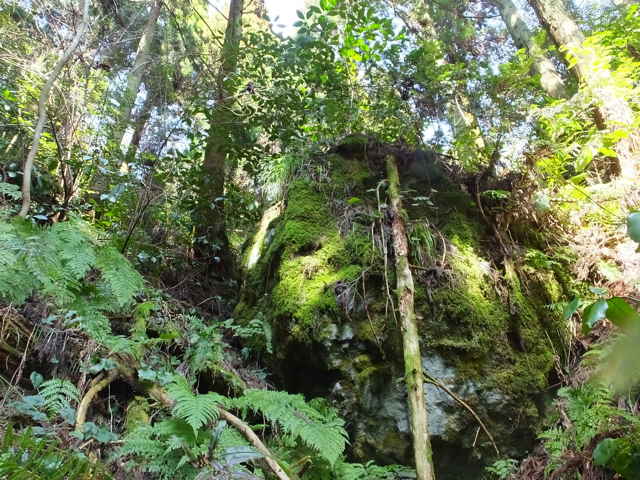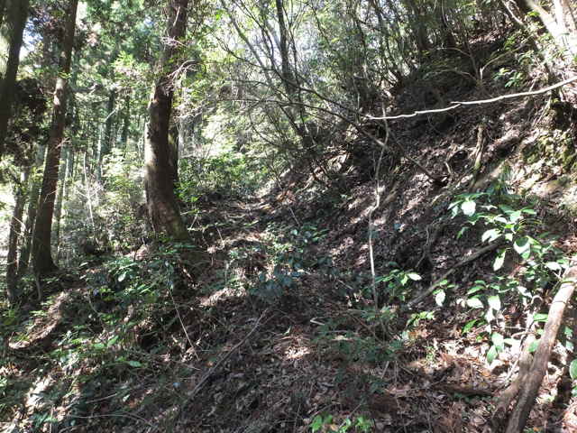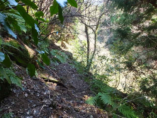 | 2月2日、2月15日、2月20日に探した東持田町の納蔵西から持田川沿いに上がっていく持田川旧道(仮称)へ、4回目の挑戦となります。この旧道は昭和初期の旧版地形図に載っており、林道澄水山線ができるまでは、東持田町から島根町へ峠を越えるルートでした。今日こそ、目的の峠まで上がってみようと思います。 東持田町納蔵西から谷へ入り、大平滝を過ぎ川沿いに上がって行くと、開けた草地の斜面に出てきます。ここから川原へ下りるような感じになりますが、旧道は草地の斜面を横切り、木々の間から谷の斜面の径になります。斜面の径は崩れやすく、狭くなっています。今日は前回に使ったロープの余りを、短いですが危ういところに張っておきました。斜面の径は滝の上部を越えて行きますが、滝を越える部分には石垣が組まれていて、昔の旧道であったことが偲ばれます。 滝を過ぎたところで川を渡っていくと、倒木が径に横たわり、その先に大きな滝が見えてきます。この滝の手前には、滝の上部を越えていく斜面の径があったように思われますが、斜面の径が崩壊しているようです。崩れた斜面には、掴めるような木がなく滑り落ちそうですが、先日簡略的にロープを張ったおかげで、幾分か安心して通れるようになりました。斜面を横切り、滝の直前の急な崖をロープを頼りに上がると、斜面の上に滝を越えていく径が残っています。 滝の上部を越えると、径は倒木のある川沿いに続き、その先にはまた大きな滝があります。滝の両岸は急斜面で径はなく、滝の手前から斜面に斜め後ろに向かって径が上がっており、その上に川上へ向かって径が続いています。滝の上部を越えて行くと、斜面の藪の下には水の流れ落ちる音がしており、滝が連なっているようです。 この先の斜面の径は当初、木々の枝が伸び放題の藪になっており、通れる状態ではありませんでしたが、ほとんど枝を切ったので、歩きやすくなりました。径を進むと、大きな長椅子のような岩が横たわっており、昔の人はここで休んだのかなと、想像してみたりします。ここから少し進むと平坦になり、川に出会います。 川のある場所は少し開けた場所になっていて、川を渡っても径があるのかなと思いながらも、今までは川を渡らず直進して、少し先から川を渡っていました。今日は川を渡ってから、川沿いを下って確かめると、山際にはっきりとした踏み跡が残っており、先程川に出会ったところまで続いていました。どちらがルートなのかは微妙なところです。 10分ほど径を上がると大きな岩場となって川沿いの径はなくなり、手前の左の斜面に「く」の字形に上る径が続いていました。斜面の細い径を上がると、岩場を越えて、やがて植林地となり、谷はやや平坦になってきます。この先で小さくなった川を渡ると、径が全く見えなくなってしまいます。 川沿いに上がって行くと、右の斜面が急になってくるので、対岸へ渡ろうとしますが、川は細いものの、えぐられたように深さがあるので、簡単には渡れません。なんとか対岸へ渡って、径のない谷を上がって行くと、川が左右に分岐します。 旧版地形図から想定したルートは左なので、左の谷へ向かいましたが、この谷は狭く、両岸の斜面は急となって、非常に歩きづらくなってきます。引き返そうとも思いましたが、もう少しと思い進んでみました。谷の最奥では、目の前に高さはないものの急斜面があり、大きな岩の横からよじ登りました。崖の上は緩斜面になっており、以前に径を探して入ったことのある見覚えのある谷でした。もう少し上がると、林道の峠の少し下へ出てくるはずです。 旧道がこんな狭く急な谷を上がるはずはなく、別のルートがあるのではないかと、近くを探して見ると、U字形の踏み跡らしきものが下がっているのが見つかりました。その径を下がってみると、先程の川が分岐したところへ下りてきました。左の川を上ったのが間違いで、川に挟まれた林内の尾根筋へ上がるのが正解だったようです。はっきりした踏み跡をたどると、15分ほどで林道へ出会いました。 なんとか4度目の挑戦で、旧道を峠まで上がることができました。まだこのルート上で確認したいところがいくつかあるので、またの機会に歩いてみようと思いますが、とりあえず持田川旧道の探索はこれで終わりとします。 (2020年9月10日に再訪すると、11:56以後の谷沿いの径は、植林地の伐採に伴う倒木が谷の斜面を塞ぎ、またその上部は伐採に伴う枝葉が谷を埋め、径は見えなくなり、非常に歩きにくい状態になってしまいました。峠までは上がれないので、途中の11:52付近から斜面を林道へ上がるルートを確保しました。また10:52の草地は、イタドリや蔓植物が生い茂り、夏場はナタ等がないと通れません。川沿いが通れればいいのですが。) |
