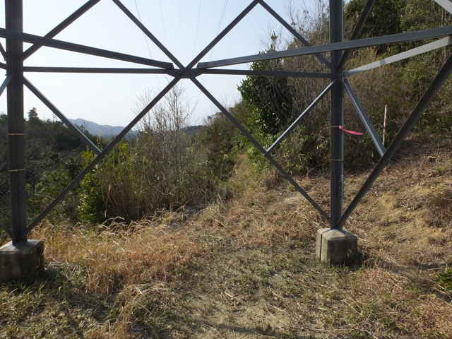 | 上講武へ出たところから出発点の東生馬まで帰るためには、大きく山を周らなければ道がありません。持田トンネルを通って、西持田町小倉から小倉寺跡への峠を越えて、ソフトビジネスパーク、林道真山線と歩いて、白鹿山の麓から鉄塔の巡視路へ入り、山を越えることにしました。 林道真山線のカーブに巡視路入り口の標識があり、急斜面をつづら折れに上がると鉄塔につきます。鳥ノ子山への登山道が上に伸びていますが、鉄塔の下からまっすぐ巡視路をたどって、次の鉄塔まで歩き、ここから急斜面を下ると、東生馬町の谷へ下りてきました。 想定していた巡視路は、もう一つの鉄塔を経由して、民家の後ろへ出てくるはずでしたが、どこかで鉄塔へ向かう巡視路から外れて谷へ下りてしまい、民家の横に下りてきました。(後で確認すると、間違いではなく、次の鉄塔No.36は民家の後の巡視路を上がっています。) |