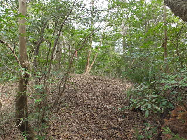 | 旧道へ分岐(16:19の位置)したところまで帰り、そこから旧版地形図にあるように、下部へ向かって尾根を下がってみました。 尾根には踏み跡が見えないので、若干ルートが違っているのかもしれませんが、現在の三叉路に下りてきました。 |