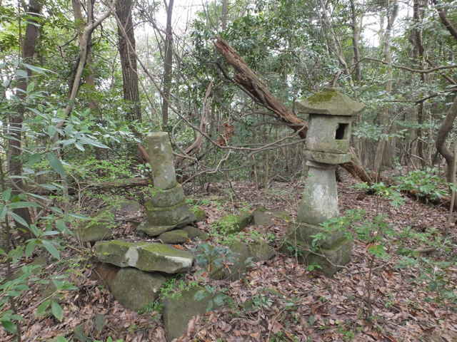 | 空中写真に見える旧道を西へ向かった途中で、分岐のあった場所(14:13の位置)を左折するのが、旧版地形図にある旧道と思われます。 分岐からしばらくは竹林の中に踏み跡らしきものが続きますが、前方が急な斜面になると踏み跡が不明になってきます。尾根に向かって上がっていくと、また踏み跡があり、すぐ鉄塔巡視路に出会います。 しばらく鉄塔巡視路を行くと、鉄塔No.10への分岐を過ぎ、左手に鉄塔No.9を見て進んでいくと、巡視路は左へ分岐しますが、旧道は直進します。 分岐から、なだらかな尾根径を20分ほど上がると、1つ目のピークに着きます。旧版地形図には旧道は神社に向かった径のように描かれていますが、途中に神社があったような形跡は見当たりませんでした。(後日、地域の方の話として「神社は、麓の日野目天神社の境内に遷したので、元の場所には何もない。」とのことでした。比婆山(久米)神社) ピークを少し過ぎたところに石灯籠があり、傍らに「一畑薬師如来」と刻まれた石柱が立てられていました。石灯籠には「文政十三年奉寄進」と刻まれているように見えました。 次のピークへは踏み跡は不明で、やや荒れた状態で、ピークも藪になっていました。 旧版地形図にある旧道が向かった神社は確認できませんでしたが、径はさらにピークの石灯籠まで続いており、一畑薬師信仰による参道ではなかったかと思われました。 |
