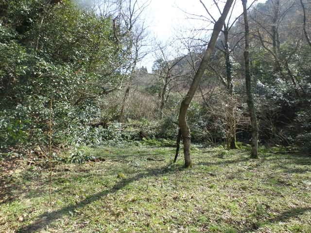 | 帰りに八雲町大谷の廃屋のあった下辺りの林道から林内を見ると、踏み跡が見えました。林道から径を上がってみると、廃屋の横へ出てきました。先程は、水田脇の径から廃屋へ向かいましたが、こちらが本来の旧道で、林道を越えて、反対側の谷の竹藪へ下りていったのではと思われます。 |