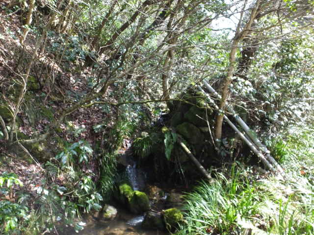 | 2020年2月24日に探した岩坂越の旧道を八雲町東岩坂別所から探してみようと思いました。 八雲町東岩坂の別所地区の国道432から東出雲町上意東への林道があります。この林道は1970年代になってからできており、それ以前は谷を川沿いに上がり、大谷地区から現在の星上峠より南側の尾根を越えて東出雲町萱野地区へ下りて行ったものと思われます。昭和20年代の旧版地形図を頼りに岩坂越の径の跡をたどってみようと思います。 別所地区から林道へ入り、しばらく現在の林道を上って行くと、道が右へとカーブし、反対側の山際を通るようになります。このカーブの起点のところに橋があり、この橋の袂から、川沿いに細い道が上がっています。今は谷の田んぼも耕作されていないので、径は荒れていると思いましたが、伸びた枝もなく、歩きやすい状態でした。この山の斜面が最近植林がされているので、そのための通路になっていたのかも知れません。 廃田跡の脇を通って15分ほど上がると、林道から下りてきた作業道が橋を渡ったところに出会います。この作業道は林道ができたころに車を使うために作られたものでしょう。以前の旧道はどこを通っていたのかわかりません。広い作業道はしばらく谷を上がって行きますが、5分ほど上がると荒れてきて藪となってきます。さらに枝を切りながら10分ほど上がると、径が川で途切れてしまいます。 川の左は山の急斜面が迫り通れないので、狭い川を対岸の斜面に上がりました。斜面の上は荒れ地になっており、蛇籠が積んであるので、ここは林道の造成工事によって谷が埋められた場所ではないかと思いました。そのため径が消えてしまっているのかもしれません。 川沿いも藪になっていて、径らしいものも見えませんが、川に沿って上がっていくと、廃田の脇に出てきました。廃田の畦道を進んでいくと、川はさらに細くなって、さらに谷は続いていますが、藪が深くなり進めそうにないので、ちょうど林道から作業道が下りているので、谷歩きはここで終わりとして、林道を上ることにしました。 林道を星上峠の手前まで上がると、大谷地区があり右手に棚田があります。水田脇の径を上がり、さらに林道から分かれた舗装道路を上がって行くと、ガードレールの先に古い荒れた径が左へ続いています。径を入っていくと、崩れた場所や倒木もありますが、奥へ進むと廃屋がありました。 廃屋から山へ向かって径のような跡があり、竹林の中へ上がっていました。枯竹を避けながら径を上がると、民家の脇へ上がって来ました。民家へ向かっては方向が違うので、竹林の入り口まで引き返しました。 方向を確かめて竹林へ向かいましたが、踏み跡のようなものは見えません。ただ、径の跡なのか溝のようなものがあるので、上に向かってみることにしました。しばらく枯竹を避けながら上がっていくと、平坦な場所へ出て、さらにその奥の尾根のような場所に石灯籠が一基立っていました。明治十六年と刻まれていました。またその脇には小さな石仏が祀られていました。この石灯籠が何を意味しているのかはわかりませんが、このルートは以前には多くの人が通った径であることに間違いないようです。 石仏の脇には斜面に沿って踏み跡があるように見え進んでみましたが、斜面には枯竹があるのみで、踏み跡は見つかりませんでした。しばらく行くと斜面の上に尾根が近く見えるので、斜面を上がると、先日2月24日に上がった星上山への登山道に出会いました。 先日東出雲町側から上った場所なので、ここが旧道の岩坂越の場所に間違いないと思われ、八雲側へ再度踏み跡はないかと確かめましたが、それらしき跡は見えませんでした。 登山道を越えて、斜面を下ると広い作業道に出会います。この作業道はゼンリン地図には載っていますが、近年になってからのものと思われます。旧道は直線的に下がっていたと思われ、谷の竹林を下がりました。竹林を抜けるとその先、径がないので溜池の堤塘を渡り、堤塘の斜面を下りると、星上峠から下ってきた林道に出会います。 林道に下りてから、その続きの径を探すと、ちょうど林道の反対側の斜面に小さな径が下がっているようでした。溜池の脇から径を下ると、萱野の集落の道に下りてきました。 ここから市穂神社まで谷に沿って下りたようなので、民家前を通り径を探していると、作業中の方に話を聞くことができました。偶然にも先日山越えの径を尋ねた方と同じ人でした。小学生時代には「この水路脇の径を通っていた。」ということだったので、水路脇の径を下がってみましたが、民家の後ろを過ぎたころからは、枯れすすきに覆われ、斜面を下りる辺りは笹薮となっていて、径も見えませんでした。 峠を越えたところからは、旧版地形図にある旧道はほとんど位置を特定できませんでした。またいつか機会があれば、市穂神社あたりから逆のルートで探してみたいと思います。 |