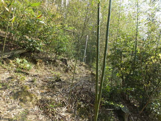 13:02 作業道が分岐する。 | 分岐の間の竹林に旧道らしき径がある。 |