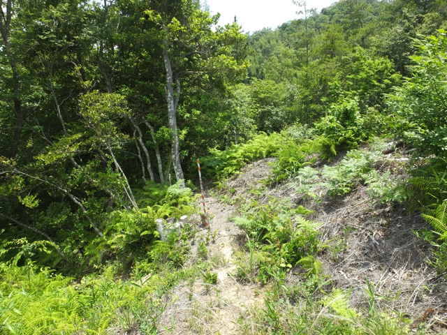 | 14:13 急傾斜の尾根を上がる。 | 長海町 14:16 なんとなく踏み跡が続いているようだ。 | 14:18 傾斜がきつくなる。 |