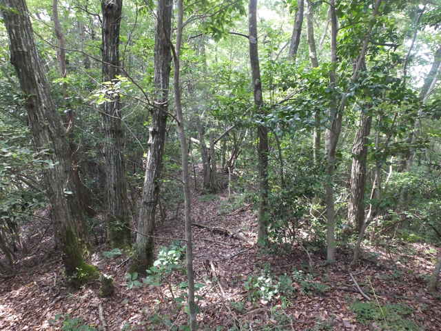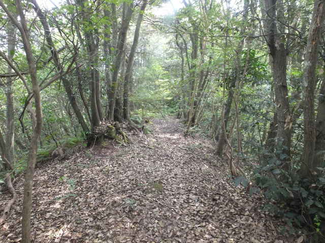 | 昭和22年発行の旧版地形図を見ると八雲町熊野の稲葉から谷を入って、山越えをする径が描かれているので、確認しようと出かけました。同じ山の、林道島村線から山越えをして、二つ西隣の谷へ下りる径(現地形図にある破線の径)を、2016年3月20日に歩いているので、帰りはこのルートを通ろうと思いました。 稲葉地区の常栄寺の近くにある稲葉集会所の前から、谷へ向かって作業道が続いています。作業道を2分ほど入ると、草刈りされた径が終わり、その先には草に覆われた作業道が続いているように見えます。通れるかどうか不安になりますが、入ってみるとまだ草はまばらなので、通り抜けることができました。草地を抜けると作業道は終わり、山へ入るようになります。山の入口はササに覆われていますが、ササはまばらで、右手に見える溜池の脇に細い踏み跡が続いていました。溜池の脇を抜けると、少し開けた谷へ出てきました。 谷は右へ曲がっており、谷間を上がっていきましたが、踏み跡はほとんど不明です。旧版地形図を見ると、谷の奥へ入らず途中から斜面を尾根筋へ上がるようになっているので、適当なところから、谷の左側の斜面にとりつきました。踏み跡は見えませんが、急傾斜の斜面を木々に掴まりながら尾根に上がりました。(あとで旧版地形図をよく見ると、谷へ入ったところから、すぐ斜面に向かっているように思われます。) 尾根にはしっかりした踏み跡が上下に続いており、尾根を下がったところにある常栄寺あたりから、上る径があるかもしれません。 尾根にははっきりした踏み跡があり、あまり起伏のない径が続いていますが、ところどころに枝が伸びて、通りづらいところもあります。右側の斜面から上がってくるはずの旧道の踏み跡がないかと注意をしていましたが、見つかりませんでした。旧道は、隣の谷を周るように尾根筋を通っていますが、一番奥のピークから直進していまい、径を間違えました。踏み跡が不明になり、間違いに気づいて、ピークまで引き返し、南に向かいました。 南に向かうと、尾根は伐採地との境界となっており、切り株から枝が伸びだして、少し歩きづらくなっています。旧道はほとんど林内を通っているので、眺望はほとんどありませんが、伐採地のピークからは天狗山や空山を見渡すことができました。 ピークから下がって5分ほどで、次のピークへ上がります。ここが最後のピークで、ここから下がったところで、地形図の破線の径に出会い、谷へ下りて行くと、思っていました。ピークから下がると、シダに覆われて踏み跡もはっきりしなくなりますが、少し下がると、上から下りてくるシダのない踏み跡に出会いました。これが地形図の径だと思いましたが、はっきりした径のわりに、いつまで経っても谷へ下りる気配がありません。GPSを確認すると、地形図の径と接した後、分岐して尾根を下がっていました。径ははっきりした踏み跡が続いているので、このまま下ることにしました。ところどころ倒木があったり、シダに覆われていたりしますが、どこに下りるのだろうと思っていると、麓の墓地の裏に下りてきました。 この旧道は、最初の尾根へ上がるルートがはっきりせず、また急斜面なのですが、尾根は旧道らしく踏み跡もしっかりして、起伏もないので、面白いルートだと思います。 どこで地形図の破線の径と別れたのか不明なので、確認してみたいと思います。 |