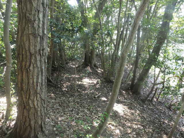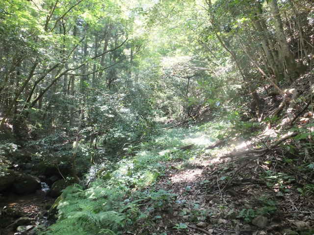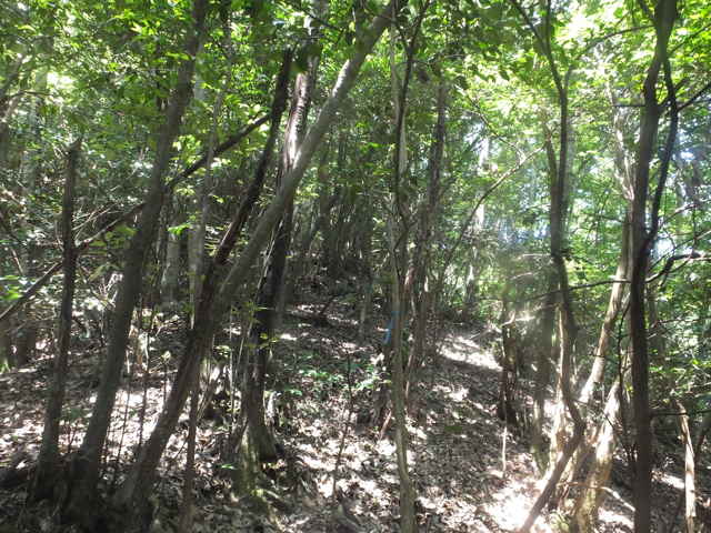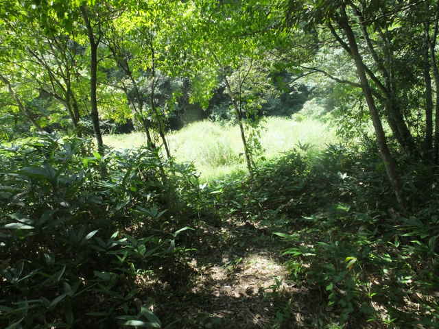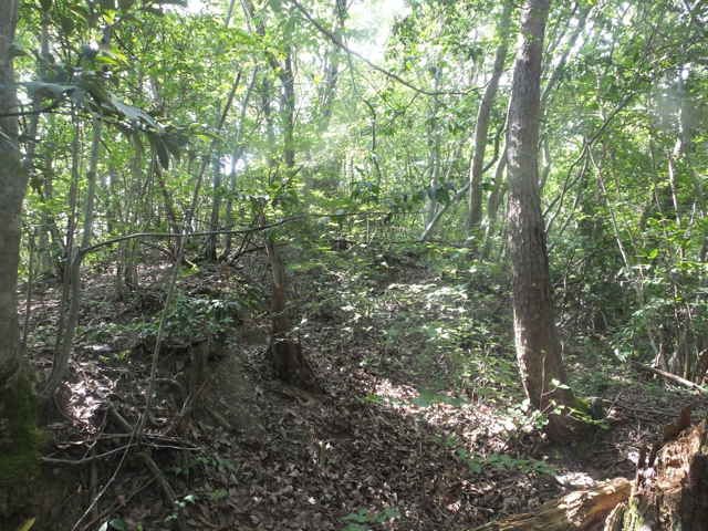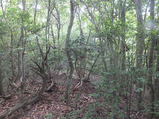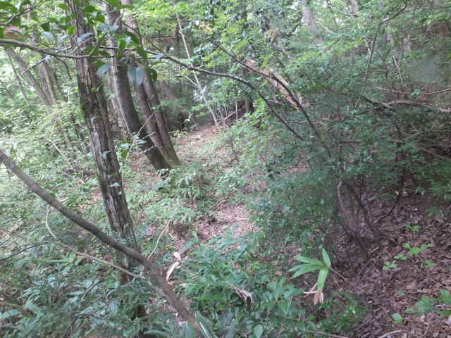 | 先日(8月18日)に歩いた稲葉の旧道の、谷から尾根に上がるルートが若干旧版地形図とは違うようなので、再度斜面に踏み跡はないか確認することにしました。 溜池脇から谷へ入ると左は急斜面で、踏み跡の痕跡は見当たりませんでした。上がれそうなところは、先日の尾根筋の斜面しかないようです。谷の奥へも入ってみましたが、やはり上がれそうな場所はありませんでした。 先日上がった斜面まで引き返し、尾根に向かって上がりました。上がる途中で、交差するような踏み跡はないかと注意をしていると、1箇所だけ左へ斜面を横切る獣道のようなものがありました。しかし、これもたどってみると途中で消えてしまい、違うようです。結局、谷から尾根に上がる旧道のルートは、確かめられませんでした。 尾根から下っていく踏み跡がありそうなので、下ってみました。しばらく尾根を下ると、前方が急斜面となっていました。右の尾根筋が伐採された植林地で、作業用の踏み跡があるので、伐採地の急斜面を下りました。急斜面を谷へ下りると常栄寺の西の谷にある作業道へ出てきました。 |