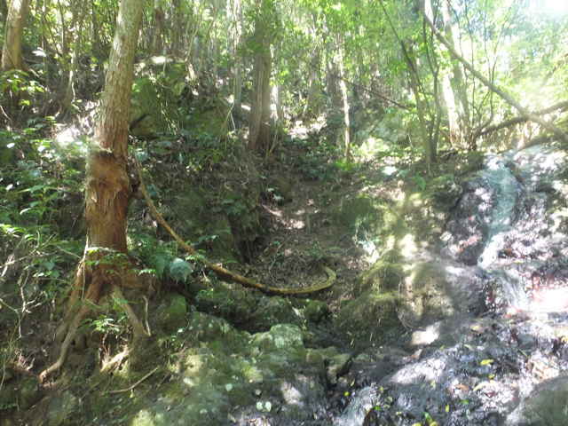 | 東持田町 岩場にロープを張った。 | 13:40 滝の左の斜面の木にテープがある。 | 13:46 超急斜面を上がる。 |