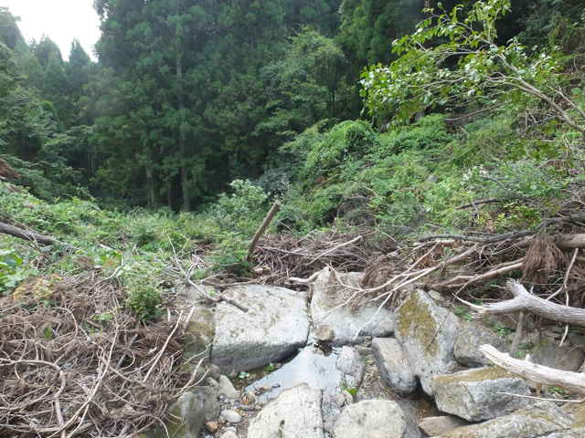 | 以前に持田川旧道(仮称)を歩いていますが、峠付近の植林地が皆伐されたということなので、様子を見に行きました。 峠からの旧道への入口付近は以前のままですが、谷へ下りると植林は全て伐採され、切り落とされた枝葉が谷を埋めていました。そのため径は見えなくなり、また川の上にも折り重なっているので、足を踏み外すと危険な状態になってしまいました。谷を下がってみると、谷の斜面に伐採された大木が倒れ込んでいて、通れなくなっていました。もう少しで皆伐地は終わるので、林道へ上がり、少し下がったところから様子を見ることにしました。 林道を少し下がると、右側に伐採のために平場ができており、そこから前方にある残っている植林地との境へ向かってみました。林内を探すと、緩やかな斜面が谷へ下がっている場所があり、すぐ谷へ下りることができました。飛び石を伝って川を渡ると、斜面に旧道が続いていました。しばらく上がったところで、先程見たとおり、倒木が斜面を覆い、通れなくなっていました。 この旧道は、峠までは上がれなくなりましたが、ここから林道へ上がれるので、行き止まりの状態は回避できました。 |