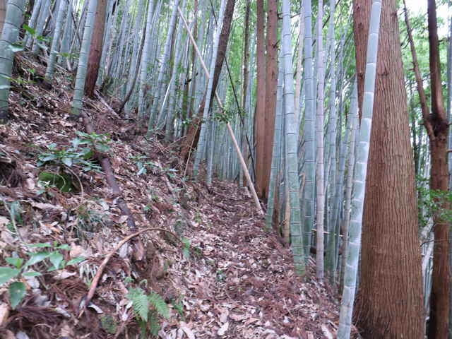 「宍道町史」に、「祭神、天鳥船神が岩船によって当地に降臨したと伝え、当社より300m先の中ノ谷にある岩がその時の岩船とされている。」とあり、「神社明細帳」には「此社より戌亥に當り里程三町計の所に船形の岩有りしを以て社号も昔より岩船神社と唱ひ奉りし社なり」とあります。 市道から山陰道のトンネルを抜けると谷の入口になり、鉄塔(JR西日本来待線No.8)巡視路の標識があり、急斜面を上がるとすぐに尾根へ上がってきます。巡視路は尾根を左へ向かうようですが、溜池に向かって下りることにします。 尾根から斜面に向かって大きな岩があります。これも岩船の候補になるかもしれませんが、若干位置と距離が合わないようです。谷を下がると、また少し大きな岩がありました。この谷の左には小さいですが、古い石切り場の跡がありました。来待石の産地ですので、岩山が多く、露出した大きな岩も多いようです。 溜池まで下がって、縁に沿って下がって堰堤まで行くと、ここらあたりの斜面の上が、神社から西北へ300mほどの所になります。 ここからまた東へ斜面を最初の谷まで歩きましたが、大きな岩はありますが、岩船として祀るような岩とは思われませんでした。 この溜池のある谷が「中ノ谷」で、谷の反対側も少し歩いてみると、池の縁にも大きな岩がありました。水辺の大きな岩として岩船のイメージも浮かびますが、若干距離が近いように思われます。池の縁の中ほどまで行ってみましたが、これから先は神社のほぼ北側になり、距離も近くなるので、ここで引き返しました。 池の堰堤の南側から山道が続いており、どこから上がってきているのか登ってみると、すぐに尾根へ上がって、尾根の先には牛荒神が見え、西城寺の西から上がる道に続いていました。 白石から西来待の内ヶ峠へ続く道端に石地蔵があり、よく見ると頭が6個ありました。六地蔵を一個で表したものと思われますが、こんな石地蔵は初めて見ました。 |