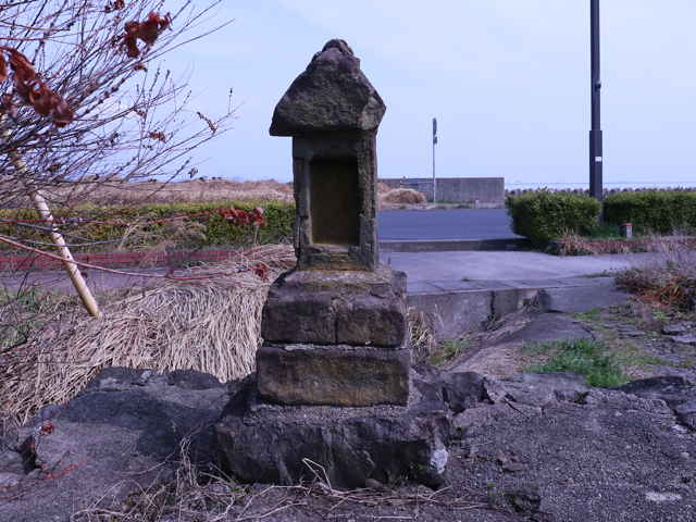 今日は、神社明細帳に載っていて、昭和中期に廃社となっている八坂神社、少童神社、恵比須神社の跡地を探しに東出雲町下意東東町を訪ねました。 下意東の海岸近くの路地を歩いていると、小さな古い石祠が祀られていました。ちょうど通りがかりの方に尋ねると、「えびすさんです。」とのことでした。多分これが、明細帳にある恵比須神社だろうと思いました。他の2社についても尋ねましたが、わからないとのことでした。しかし、「漁協の近くにも同じようなものがある。」と教えていただきました。 |
