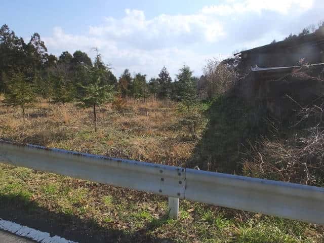 山道の向こうにすぐ舗装道路が見える。 |