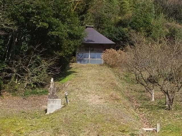農道に出た場所を振り返る。 | 岡本町 歩いた道からはずれた墓地の近くにあった町石、六十八丁。三栗屋池からの道が違うようだ。(正規ルートはこの奥の藪の中を通る。) |