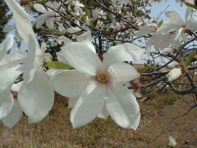 | 総合運動公園のコブシの花が満開となって、道の両側を飾っています。道を歩くと何とも甘い香りが漂ってきます。桜の花もいろいろな種類があるようで、八重桜、枝垂桜と色も華やかです。